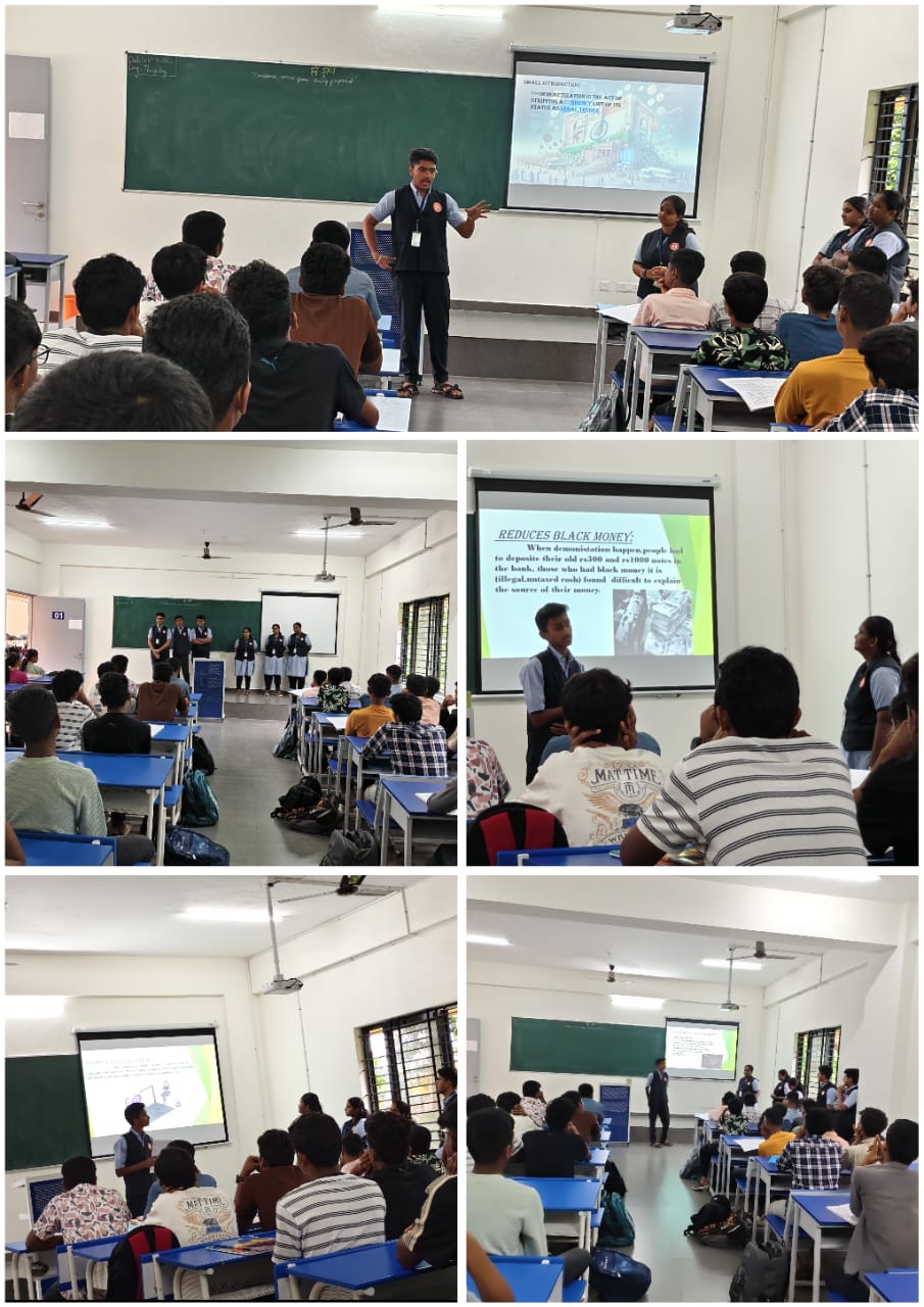 As a part of Commerce activity, our 2nd PUC Commerce students delivered a PowerPoint presentation on the topic ‘Demonetisation in India’ before their juniors. They demonstrated creativity, research skills, and teamwork to create a well-structured and insightful presentation.